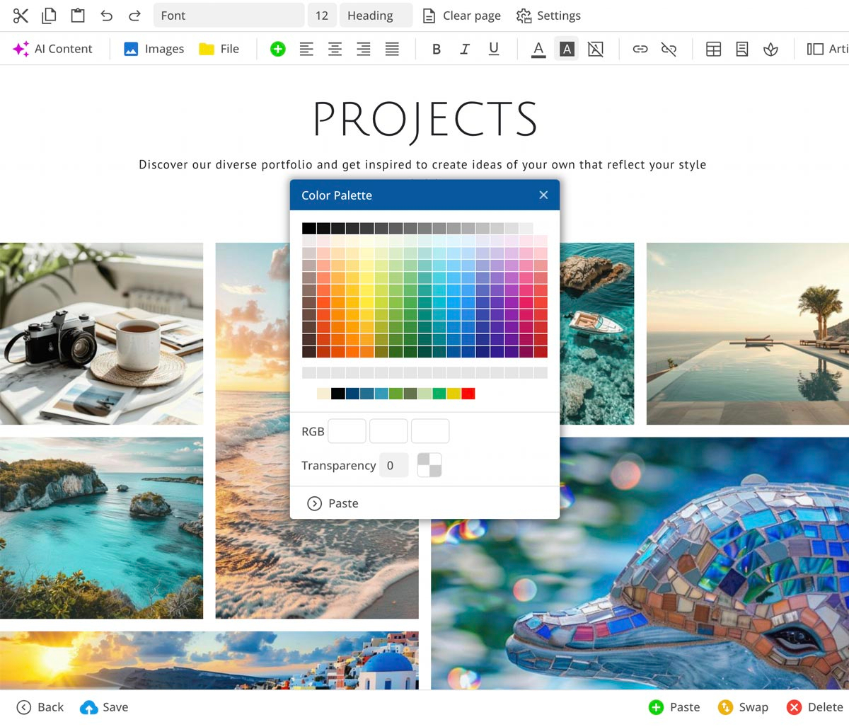 Der Editor stellt Dir verschiedene Seitenabschnittsvorlagen zur Verfügung, die exakt auf das gewählte Layout abgestimmt sind. Eine integrierte KI hilft beim Generieren und Optimieren von Texten.