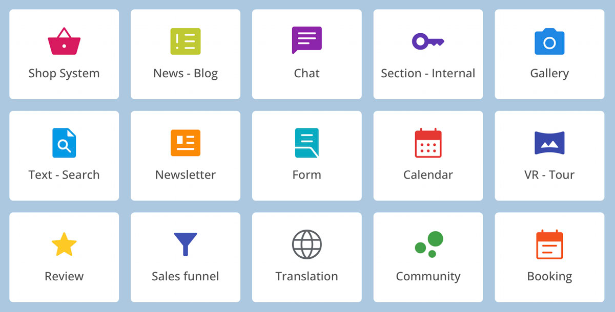 Shopsystem, News, Blog, Chat, passwortgeschützte Webseiten-Bereiche, Galerie, Community, Text-Suche, Newsletter, Formular, Kalender, Buchung, Übersetzung und Bewertung.