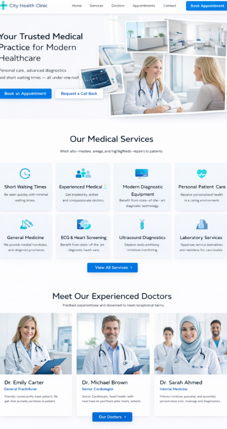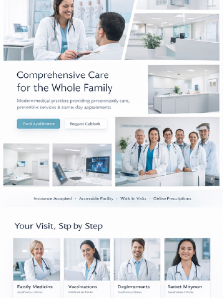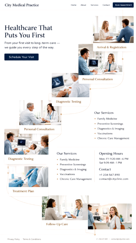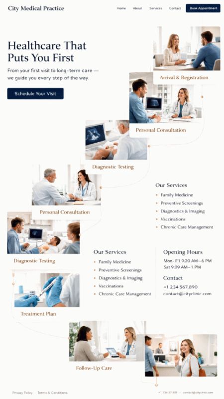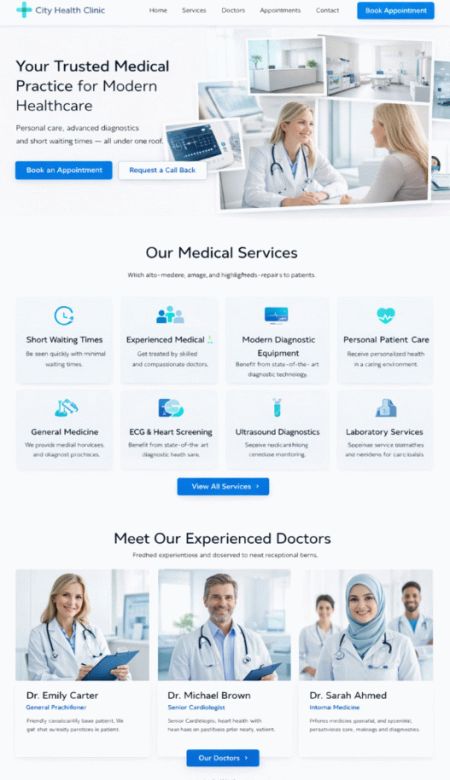 Stellen Sie Ihre Praxis professionell vor: Fachgebiete, Leistungsangebot, Team, Standorte, Sprechzeiten und Kontaktwege. Ergänzen Sie Online-Termine, Formulare für Neupatienten und klare Infos zu Abläufen.Optional mit News-Bereich, Mehrsprachigkeit, geschützten Patientenbereichen und Dokumenten-Seiten (z. B. Aufklärungsbögen, Hinweise, Downloads).