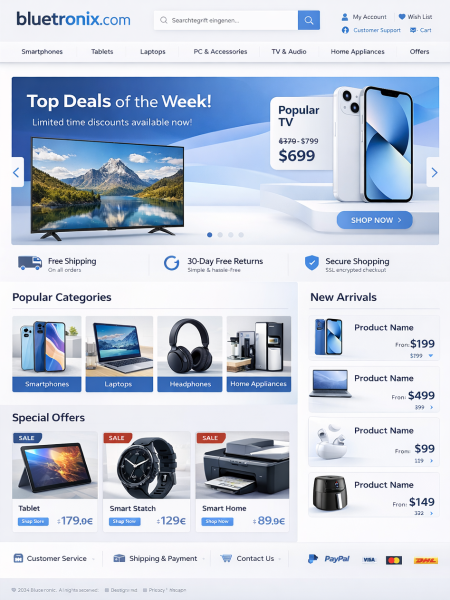 Ein moderner Online-Shop braucht mehr als schöne Produktseiten: schnelle Ladezeiten, sauberen Checkout, sichere Zahlungen, klare Versandlogik, transparente Retouren und ein System, das zuverlässig unter Last läuft. Dazu kommen rechtliche Pflichtseiten, Tracking, Marketing-Workflows und eine saubere Datenbasis.Mit bluetronix bekommst Du Deinen Shop als skalierbare Lösung – von der schnellen Start-Version bis zum Enterprise-Setup mit eigener Server-Struktur, Rollen/Rechten, Schnittstellen und Automatisierungen. Du startest schlank, erweiterst später gezielt – ohne Systemwechsel.
