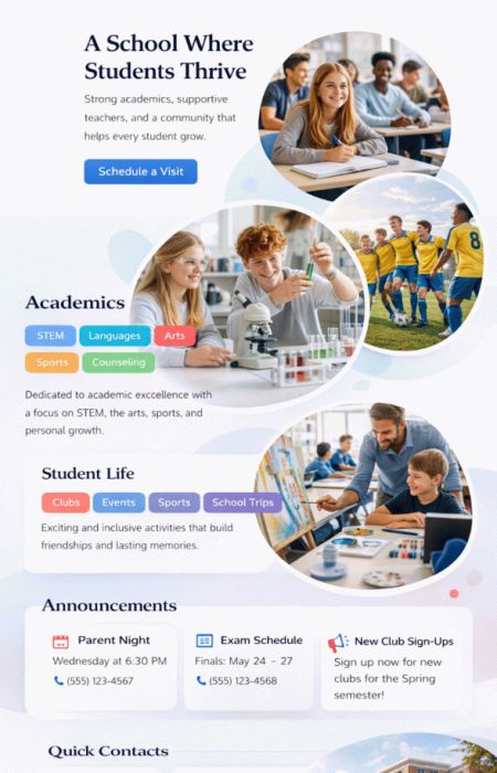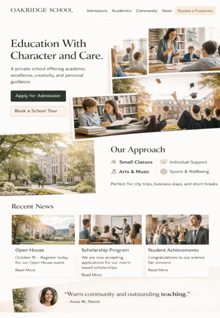Stellen Sie Schule oder Hochschule professionell vor: Leitbild, Ansprechpartner, Fachbereiche, Termine, Downloads, Anfahrt. News lassen sich mit Archiv führen, damit Infos langfristig auffindbar bleiben.Klassenfotos und Projekte können als Galerien dargestellt werden – mit Freigaben und optionalen Sichtbarkeiten je Bereich. Das Ergebnis wirkt modern und bleibt für Nutzer leicht verständlich.